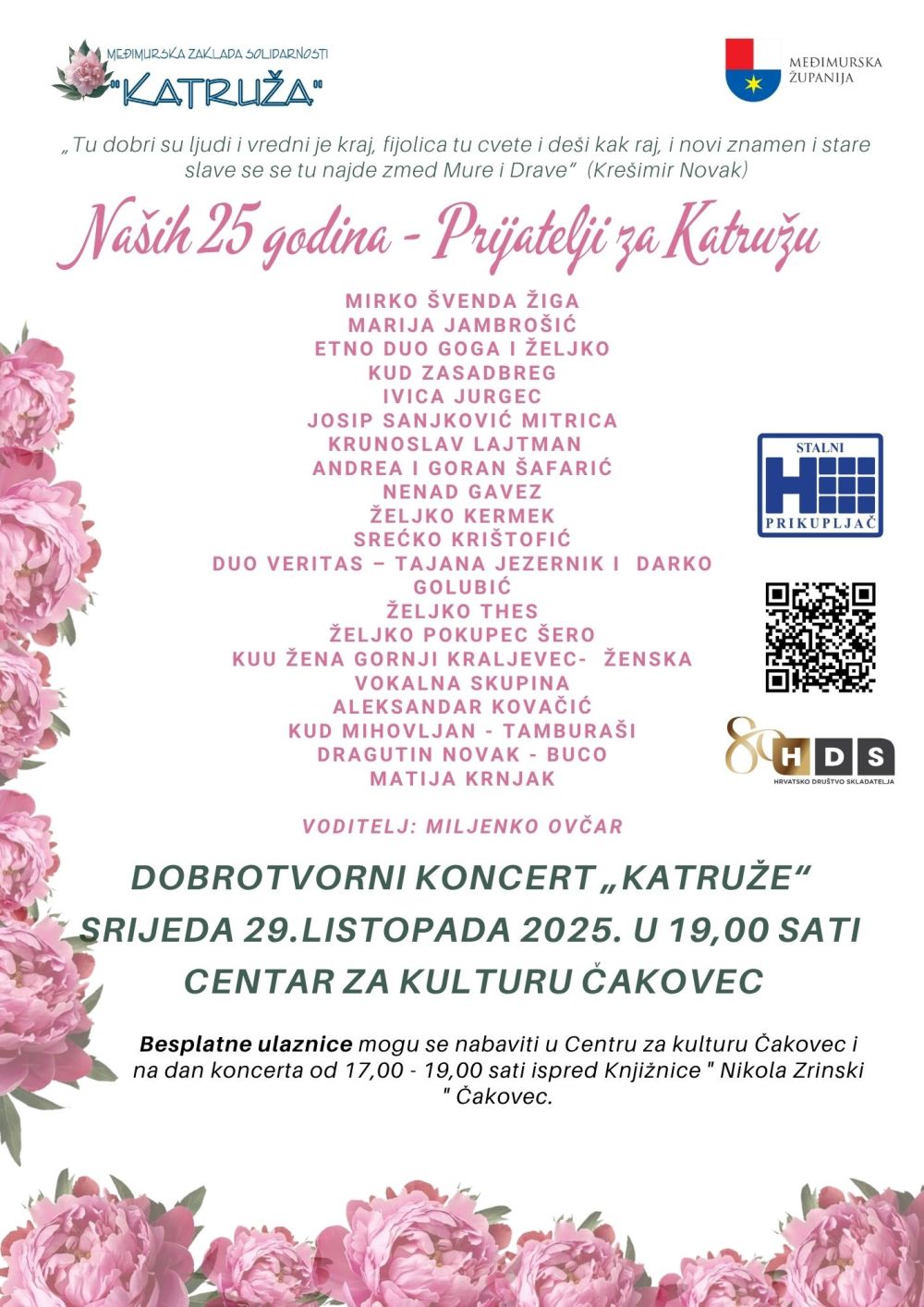 Međimurska zaklada solidarnosti Katruža slavi 25 godina humanog djelovanja što je povod dobrotvornoj glazbenoj priredbi u Centru za kulturu Čakovec, koju Međimurska županija i njezina Zaklada priređuju u srijedu, 29. listopada 2025., od 19 sati.