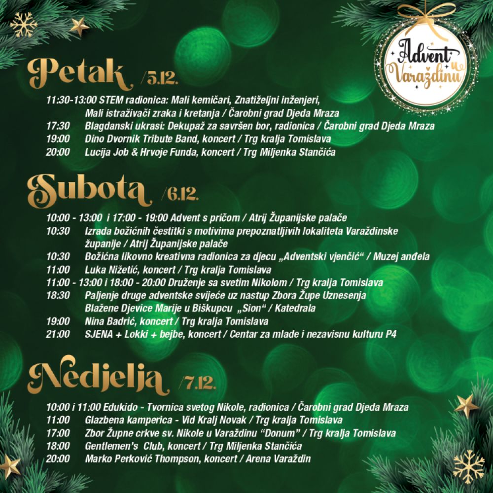 I dok će Djed Mraz zasad samo preletjeti gradom, u subotu, 6. prosinca, na blagdan svetog Nikole, koji je ujedno i Dan grada Varaždina, najmlađi će imati priliku družiti se sa svetim Nikolom na Korzu u jutarnjem terminu od 11:00 do 13:00 sati, te ponovno od 18:00 do 20:00 sati. Slavljenički dan započet će veselo i raspjevano, već u 11:00 sati Korzom će odjekivati hitovi Luke Nižetića, a od 19:00 sati pozornicu će preuzeti Nina Badrić. Njene emotivne balade, veliki hitovi i prepoznatljiva interpretacija zaokružit će slavljeničku adventsku večer. Koncert Nine Badrić Varaždinu poklanja agencija za nekretnine Eurovilla, povodom otvorenja svoje nove podružnice u gradu.