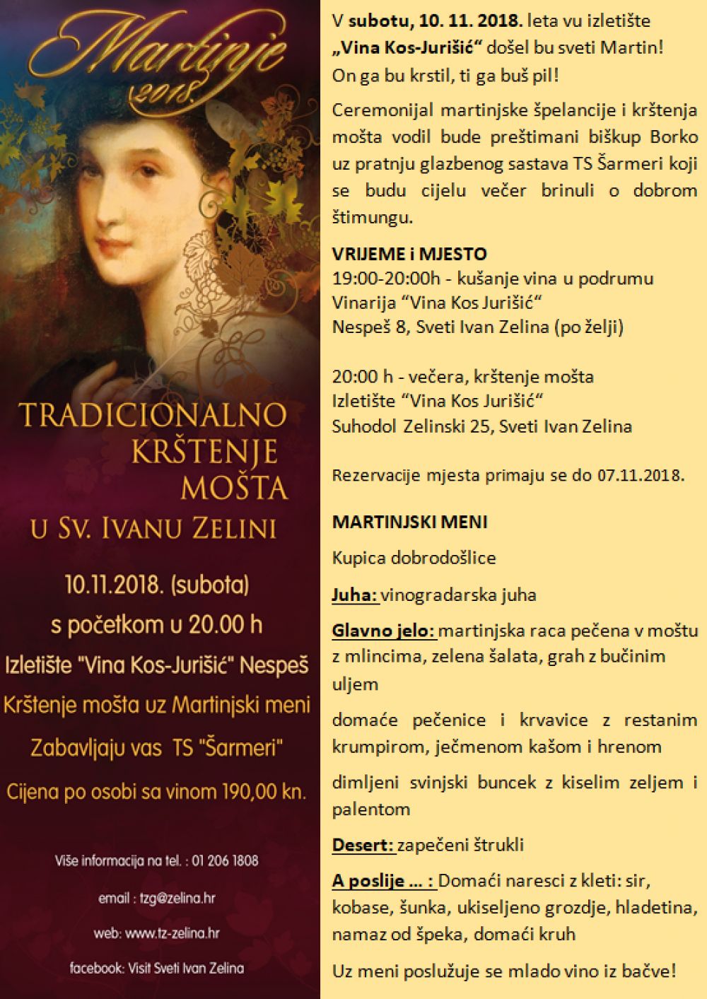 Martinje će se održati u Vinariji Kos Jurišić, u subotu, 10. studenoga. Od 7 do 20 sati - na adresi Nespeš 8, Sveti Ivan Zelina. predviđeno je najprije kušanje vina u podrumu (po želji) “Vina Kos Jurišić“ , a nakon toga od 20 sati – večera uz ceremoniju krštenja mošta u Izletištu “Vina Kos Jurišić“ Suhodol Zelinski 25, Sveti Ivan Zelina.