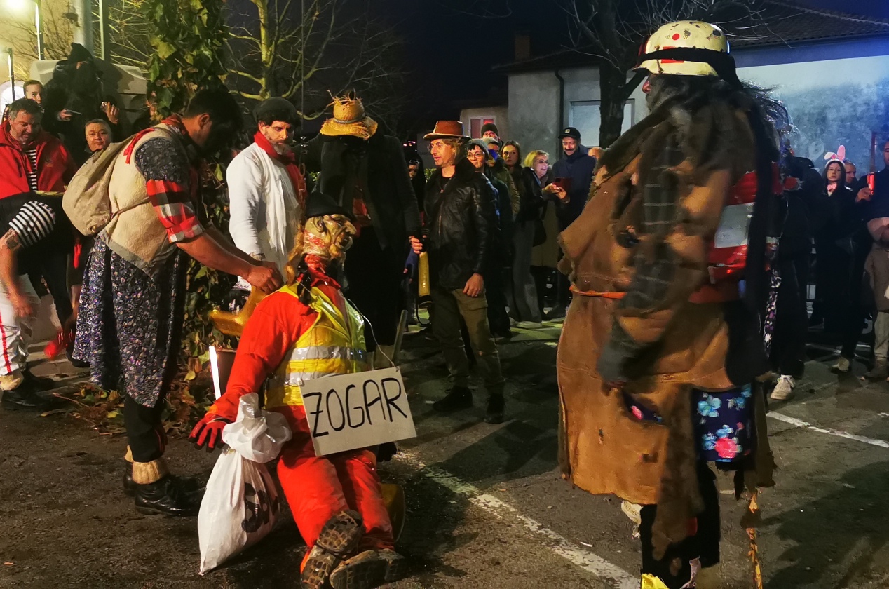 Paljenje pusta započelo je u 19 sati. Zogar, kako se u dijalektu nazivaju ljudi koji su nekada održavali puteve i ceste, bio je prikazan u radnoj odjeći uz natpis “obilazak”, kao karnevalska poruka i komentar na prometne gužve, radove i nedovoljno uređene ceste, teme koje ne opterećuju samo Viškovo i Kastav, već i šire područje. Nakon što se vatra razgorjela, zvončari su se zadržali uz žar, skidali maske i dio odjeće te skakali oko ognja i preskakivali ga.