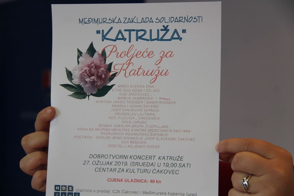 Dobrotvorni koncert u Centru za kulturu prilika je da se obilježe godine uspješnog i plemenitog rada Međimurske zaklade solidarnosti „Katruža“ i da se zahvali svima koji nesebično pomažu u provođenju njenih aktivnosti. Prihod od prodaje karata biti će usmjeren za potrebe liječenja i ostalih troškova onima kojima je to najpotrebnije. Uz koncert, u okviru humanitarne akcije „Proljeće za Katružu“ biti će održana prodajna izložba doniranih radova Likovne kolonije udruge donjeg Međimurja od 15. do 19. travnja u zgradi Scheier kao i prigodna prodaja cvijeta katruže kroz mjesec svibanj u Čakovcu, Prelogu, Murskom Središću, Nedelišću, Belici, Svetoj Mariji i Pribislavcu.