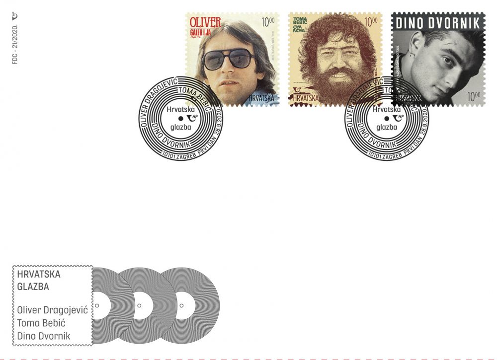 Dine Dvornika (20. kolovoza 1964. – 7. rujna 2008.), baš kao i njegov privatni i estradni život, koji su se trajno prepletali, svjedoče o golemom talentu i eruptivnoj glazbi u kojoj je, bez obzira na razmjere Hrvatska pošta pustit će u optjecaj 28. rujna 2020. nove prigodne poštanske marke iz serije „Hrvatska glazba“. Motivi na markama prikazuju reprodukcije najpoznatijih izdanja gramofonskih ploča Dine Dvornika, Olivera Dragojevića i Tome Bebića. Autori prigodnih poštanskih maraka su Ivana Vučić i Tomislav-Jurica Kaćunić, dizajneri iz Zagreba. Nominalna vrijednost marke jednaka je za svaki motiv i iznosi 10,00 kuna. Marke su otisnute u nakladi od 100 000 primjeraka po motivu od čega je 1000 arčića u pripadajućim numeriranim etuijima. Prigodne marke otisnute su u arčićima s četiri samoljepljive marke, a Hrvatska pošta izdala je i prigodnu omotnicu prvog dana (FDC). Okrugli arčići imitiraju gramofonsku ploču.