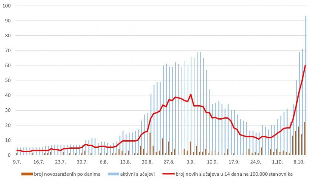 Ukupan broj aktivnih slučajeva u Varaždinskoj županiji sada je 93, od kojih se na bolničkom liječenju u Općoj bolnici Varaždin nalazi 8 osoba, a na liječenju kod kuće 85 osoba. U privitku šaljemo i graf koji za Varaždinsku županiju prikazuje broj novozaraženih po danima, broj aktivnih slučajeva, te broj novih slučajeva u 14 dana na 100.000 stanovnika.