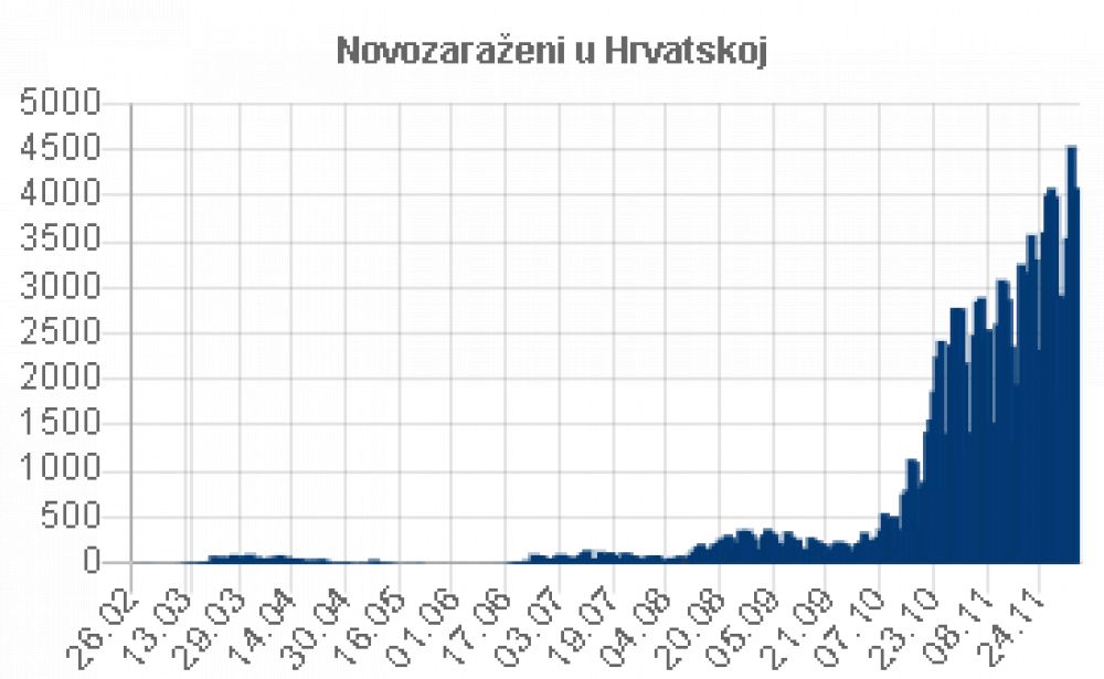 Prema podaciima Stožera u Hrvatskoj su u posljednja 24 sata zabilježena 4084 nova slučaja zaraze koronavirusom, a 70 osoba je preminulo. Ukupan broj aktivnih slučajeva u Hrvatskoj iznosi 24495. Među njima je 2514 pacijenata na bolničkom liječenju, od toga je na respiratoru 259 pacijenata. Od prvog slučaja zaraze u Hrvatskoj do danas zabilježeno je 147454 osoba zaraženih novim koronavirusom, od kojih je 2102 preminulo, oporavilo ih se 120 857, a od toga 3709 u posljednja 24 sata. U samoizolaciji je 60581 osoba. Do danas je ukupno testirano 801 545 osoba, od toga 10 662 u posljednja 24 sata.