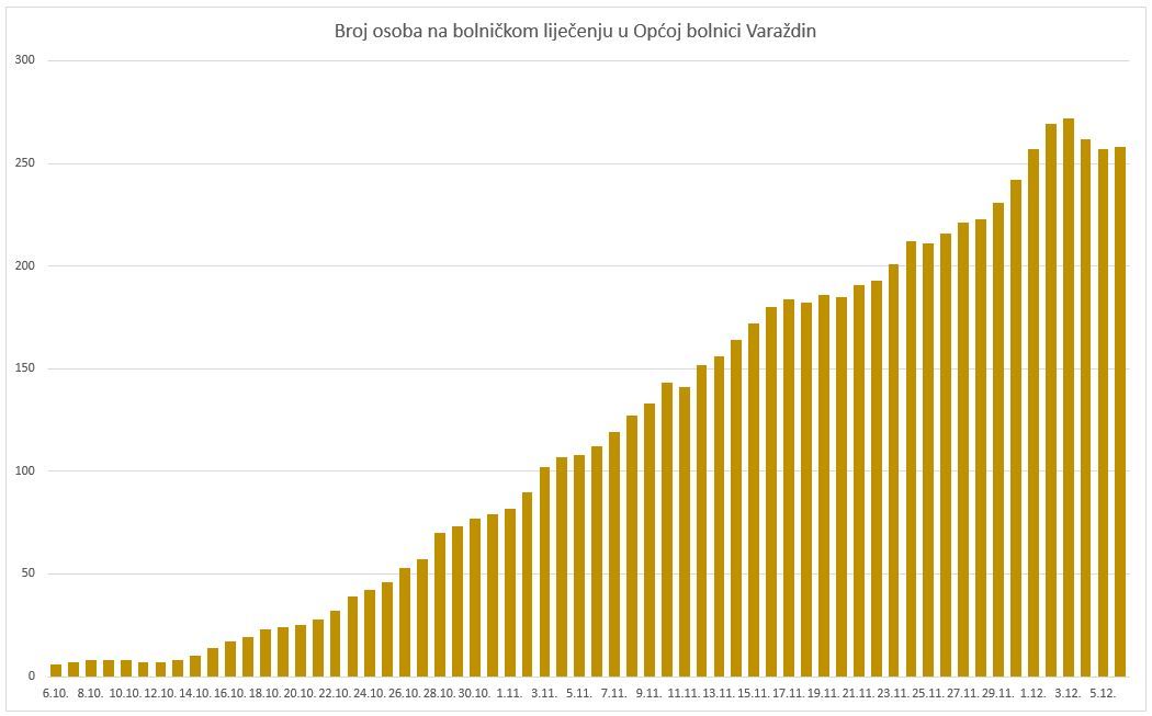 Na bolničkom liječenju u Općoj bolnici Varaždin nalazi se 258 osoba s težom kliničkom slikom. Od toga je 118 na odjelu infektologije i drugim odjelima u Varaždinu, 21 ih je u jedinici intenzivnog liječenja od kojih je 19 na respiratoru, 70 ih je u Klenovniku i 49 u Novom Marofu. Preminulo je 5 osoba pozitivnih na COVID-19. Ukupno su do sada evidentirane 142 preminule osobe pozitivne na COVID-19, od kojih 38 tijekom ovog mjeseca. S kućnog liječenja otpuštene su 262 osobe. Ovime je od početka epidemije na području Varaždinske županije broj zaraženih dostigao brojku 10472. Aktivnih slučajeva je 2369.