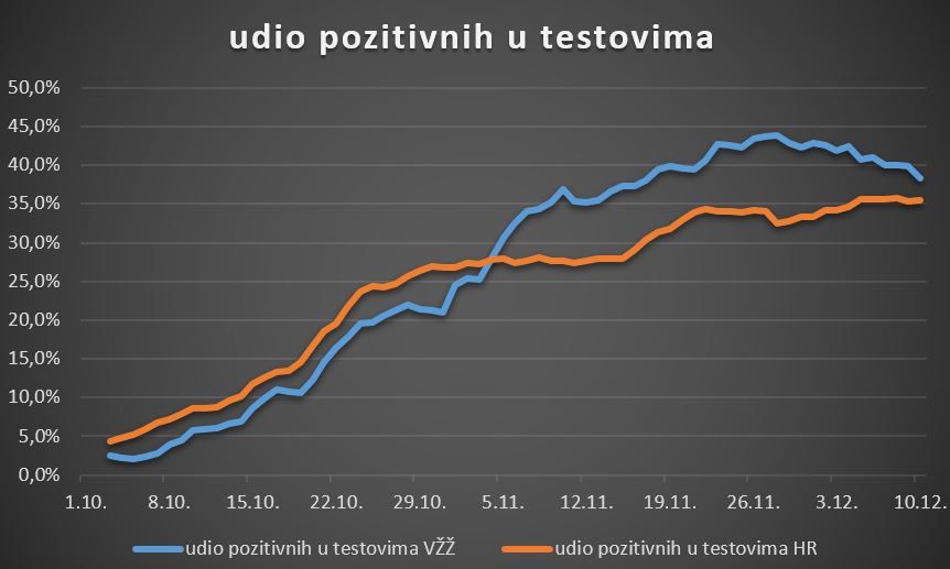 Ponovio je da svake mjere koje sprečavaju kontakte daju rezultate, pa tako i postojeće koje dovode do stagnacije broja novozaraženih, a želi li se postići više od toga, moraju se uvoditi i strože mjere. - Da bi se izbjegle priče koje također možemo čuti da „neki testiraju puno više“ ili da je „lako rušiti brojeve ako malo testiraš“, predočujemo vam i grafikon koji jasno pokazuje da u posljednjih mjesec dana u Varaždinskoj županiji kontinuirano testiramo dvaput više od Hrvatske. Udio pozitivnih u ukupnom broju testiranih pada i današnji udio od 35 posto je najniži zadnjih nekoliko tjedana. Nažalost, i dalje slušamo neodgovorne i politikantske izjave: u Hrvatskoj se više nitko ne usudi izreći da nije bilo nužno zatvoriti ugostiteljstvo osim Grada Varaždina. Pokušali su optužiti velike tvrtke da su žarišta, naveli su ih i izrijekom, a još su spomenuli i to da su u stranom vlasništvu, pa su, po njima, posebno neodgovorne.