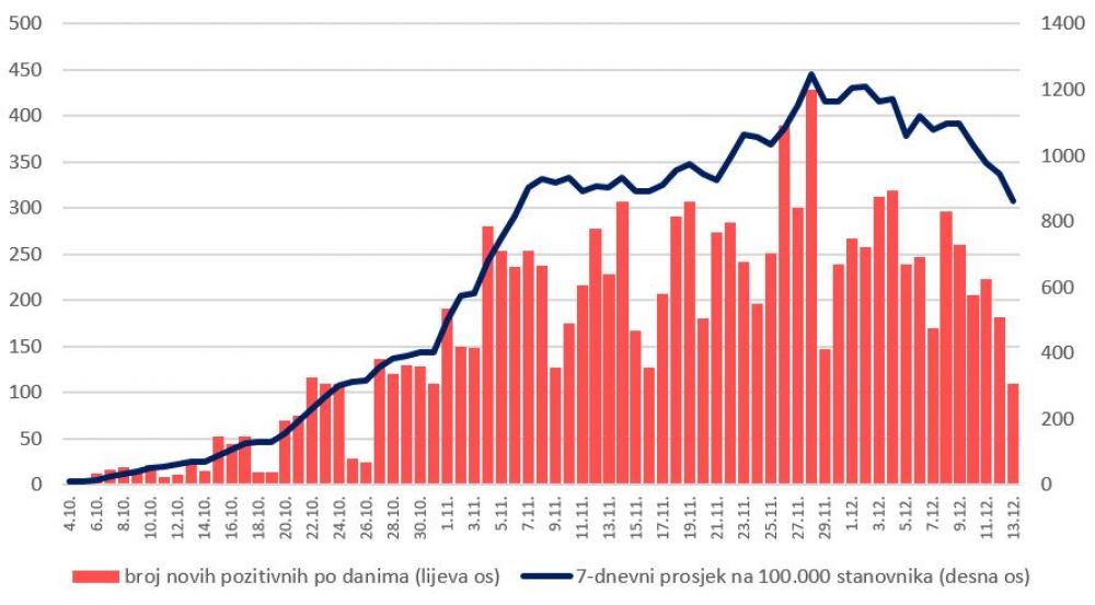 Testirano je 403 uzoraka. Udio pozitivnih na COVID-19, među testiranim uzorcima simptomatskih pacijenata, jučer je iznosio 34%, a udio pozitivnih u svim testiranim uzorcima 22%.