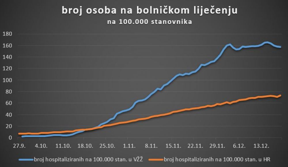 Tijekom 24 sata u Varaždinskoj županiji evidentirano je 172 nova slučajeva zaraze koronavirusom, a broj novo zaraženih unutar 7 dana na 100.000 stanovnika ovime se smanjio na 630.Varaždinska županija u posljednjih tjedan dana broji 1066 novih slučajeva. Tijekom jučerašnjeg dana testirano je 552 uzoraka. Udio pozitivnih na COVID-19, među testiranim uzorcima simptomatskih pacijenata iznosio je 45%, a udio pozitivnih u svim testiranim uzorcima 31%.Na bolničkom liječenju u Općoj bolnici Varaždin nalazi se 264 osoba s težom kliničkom slikom. Od toga je 125 na odjelu infektologije i drugim odjelima u Varaždinu, 19 ih je u jedinici intenzivnog liječenja od koji 11 na respiratoru, 73 ih je u Klenovniku od kojih 1 na respiratoru i 47 u Novom Marofu.