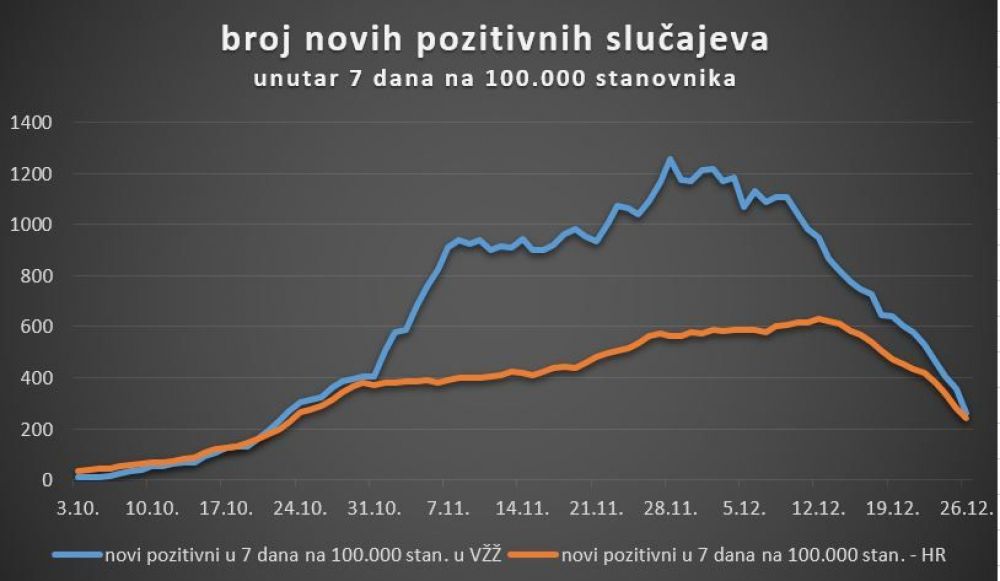 Tijekom 24 sata u Varaždinskoj županiji evidentirano je 12 novih slučajeva zaraze koronavirusom, a broj novo zaraženih unutar 7 dana na 100.000 stanovnika ovime se smanjio na 270.Varaždinska županija u posljednjih tjedan dana broji 432 novih slučajeva. Tijekom jučerašnjeg dana testirano je 170 uzoraka, a udio pozitivnih u testiranim uzorcima je 7%. Na bolničkom liječenju u Općoj bolnici Varaždin nalazi se 249 osoba s težom kliničkom slikom. Od toga je 117 na odjelu infektologije i drugim odjelima u Varaždinu, 14 ih je u jedinici intenzivnog liječenja od kojih 12 na respiratoru, 73 ih je u Klenovniku od kojih 1 na respiratoru i 45 u Novom Marofu. S kućnog liječenja otpušteno je 198 osoba, a aktivnih slučajeva je 468.