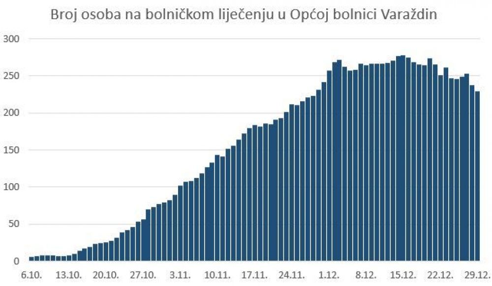 Na bolničkom liječenju u Općoj bolnici Varaždin nalazi se 229 osoba s težom kliničkom slikom. Od toga je 107 na odjelu infektologije i drugim odjelima u Varaždinu, 10 ih je u jedinici intenzivnog liječenja od kojih 9 na respiratoru, 71 ih je u Klenovniku od kojih 1 na respiratoru i 41 u Novom Marofu.