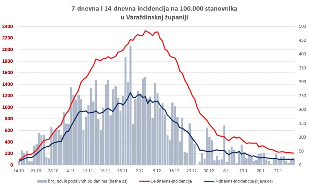 Tijekom 24 sata u Varaždinskoj županiji evidentirano je 27 novih slučajeva zaraze koronavirusom, a u posljednjih tjedan dana ukupno 155 novih slučajeva. roj novozaraženih unutar 7 dana na 100.000 stanovnika je 93, a broj novozaraženih na 100.000 stanovnika zadnjih 14 dana je 208. Tijekom jučerašnjeg dana testirano je 285 uzoraka, od kojih je 151 zaprimljen preko COVID-ambulante od simptomatskih pacijenata. Udio pozitivnih među simptomatskim pacijentima je 17 posto, a u svim testiranim uzorcima je 9 posto.