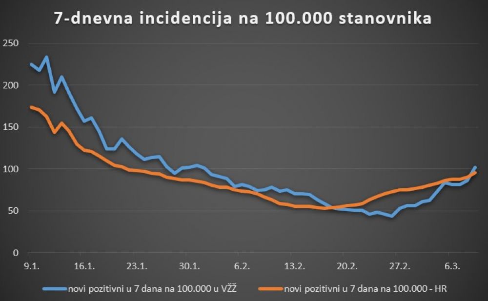 Na bolničkom liječenju u Općoj bolnici Varaždin je 41 osoba s težom kliničkom slikom, od kojih je njih 19 smješteno je na lokaciji u Varaždinu, dok se 22 osobe nalaze u Klenovniku.Trenutno se jedna osoba nalazi na respiratoru, a u posljednja 24 sata nema preminulih osoba pozitivnih na COVID-19.Tijekom jučerašnjeg dana testirano je 384 uzoraka, pri čemu je udio pozitivnih među simptomatskim pacijentima 19 posto, a udio u svim testiranim uzorcima iznosi 12 posto. Od početka epidemije na području Varaždinske županije evidentirano je 15.387 osoba pozitivnih na COVID-19. Aktivnih slučajeva je 182. U nastavku šaljemo i grafove koji prikazuju kretanje udjela pozitivnih u svim testovima, te kretanje sedmodnevne incidencije od početka ove godine za Varaždinsku županiju i Republiku Hrvatsku.
