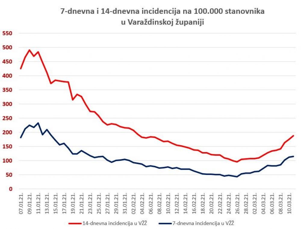 U Varaždinskoj županiji tijekom 24 sata evidentiran je 31 novi slučaj zaraze koronavirusom. Broj novozaraženih u tjedan dana na 100.000 stanovnika je 115, dok je 14-dnevna incidencija na 100.000 stanovnika 188.