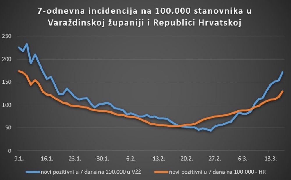U Varaždinskoj županiji tijekom 24 sata evidentirana su 42 nova slučaja zaraze koronavirusom. Broj novozaraženih u tjedan dana na 100.000 stanovnika je 183, dok je 14-dnevna incidencija na 100.000 stanovnika 298.Na bolničkom liječenju u Općoj bolnici Varaždin nalaze se 54 osobe s težom kliničkom slikom, od kojih je 21 smještena na lokaciji u Varaždinu, a 33 osoba se nalazi u Klenovniku. U jedinici intenzivnog liječenja, na respiratoru su 4 osobe, a u posljednja 24 sata preminula je jedna osoba pozitivna na COVID-19.Tijekom jučerašnjeg dana testirano je 355 uzoraka, pri čemu je udio pozitivnih među simptomatskim pacijentima 26 posto, a udio u svim testiranim uzorcima iznosi 12 posto.