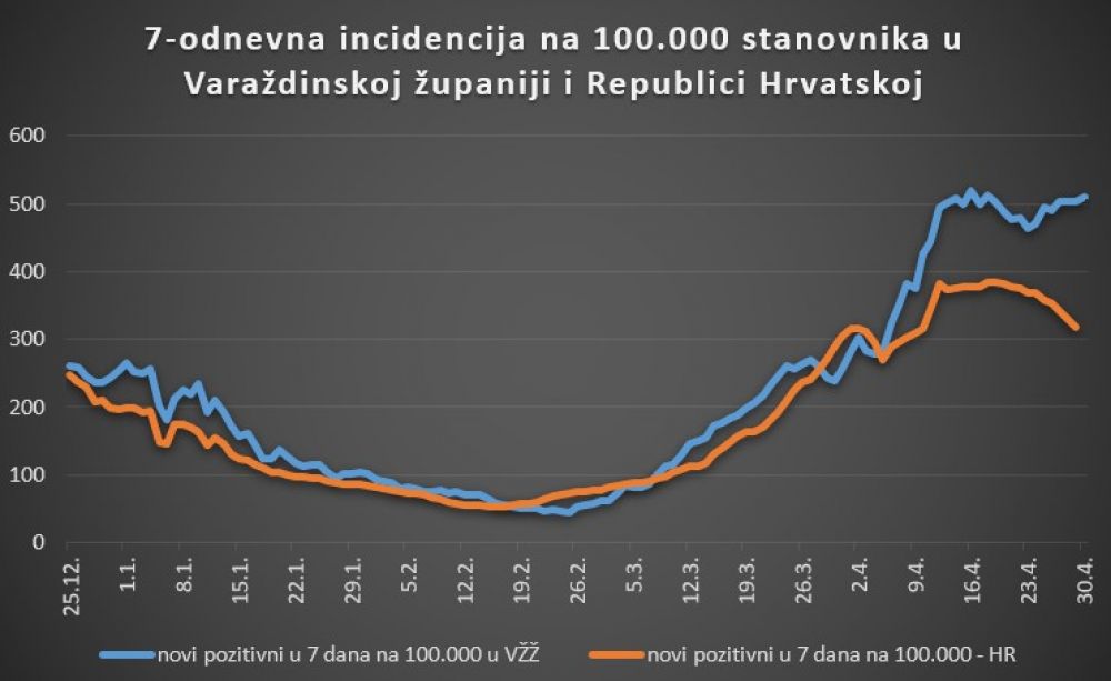 U Varaždinskoj županiji je tijekom 24 sata evidentirano 118 novih slučajeva zaraze koronavirusom. Broj novozaraženih u tjedan dana na 100.000 stanovnika je 510, dok je 14-dnevna incidencija na 100.000 stanovnika 975.