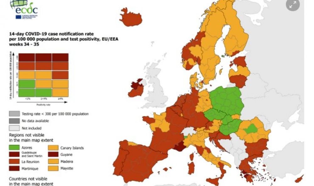 Epidemiološka karta ECDC-a za Europu objavljuje se svaki tjedan na temelju 14-dnevne incidencije i udjela pozitivnih testova u ukupnom broju testiranih.