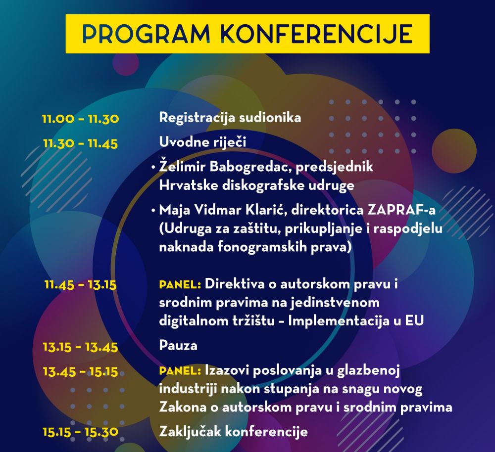 Zagreb će 17. studenog u hotelu Westin biti domaćin Međunarodne konferencije o digitalnim pravima u glazbenoj industriji na kojoj će govoriti predstavnici Svjetske diskografske organizacije - IFPI, pravni stručnjaci s King's College u Londonu, predstavnici švedske i talijanske diskografske udruge, Universal Music grupacije, ali i naši pravni i glazbeni stručnjaci. Tematski, konferencija je podijeljena kroz dva panela, jedan pod nazivom: ‘’Direktiva o autorskom pravu i srodnim pravima na jedinstvenom digitalnom tržištu - implementacija u EU’’ te ''Izazovi poslovanja u glazbenoj industriji nakon stupanja na snagu novog Zakona o autorskom pravu i srodnim pravima''. Domaćin ove konferencije je Hrvatska diskografska udruga i kolektivna organizacija proizvođača fonograma (ZAPRAF), a povodom održavanja ovog događaja, direktorica ZAPRAF-a, Maja Vidmar Klarić istaknula je: ''Organizacijom ove konferencije, Hrvatska diskografska udruga i ZAPRAF pozicioniraju Hrvatsku unutar pravne, ali i glazbene struke. Ona će tematski pružiti mogućnost dobivanja dodatnih informacija, ali i edukacije našim pravnim stručnjacima, članovima političke javnosti koji rade na implementaciji europskih direktiva te brojnim diskografima i samim izvođačima. Ponosni smo što će ova konferencija obraditi aktualne teme glazbene industrije na jedan širi način, osobito imajući u vidu da je Hrvatska implementirala svoju verziju europske Direktive te donijela unikatno zakonsko rješenje kojim uvodi retroaktivnost čime se otvaraju milijunski sudski sporovi, zatrpavaju sudovi s novim predmetima te uvodi pravni kaos budući da je zakon nedorečen, a sve zbog interesa određenih skupina.'' Očekuje se da će konferenciji prisustvovati više od 200 sudionika. Službene prijave i više o samoj konferenciji, možete pronaći na: https://musicindustryconference.online/