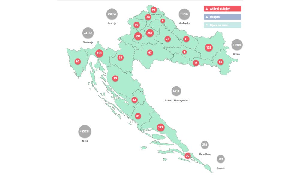 Od 25. veljače 2020., kada je zabilježen prvi slučaj zaraze u Hrvatskoj, do danas ukupno je zabilježeno 1.259.759 osoba zaraženih novim koronavirusom, od kojih su 17.473 preminule, ukupno su se oporavile 1.239.924 osobe od toga 270 u posljednja 24 sata.