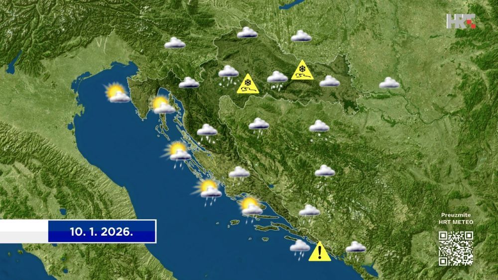 Podjednake vrijednosti i u središnjoj Hrvatsskoj, a navečer i u noći na nedjelju bit će niže. U večernjim će satima na krajnjem sjeveru zapuhati umjeren sjeverni vjetar. Bit će oblačno, mjestimice uz snijeg ili kišu te smrzavanje oborine na tlu, ponajprije tijekom noći i jutra.
