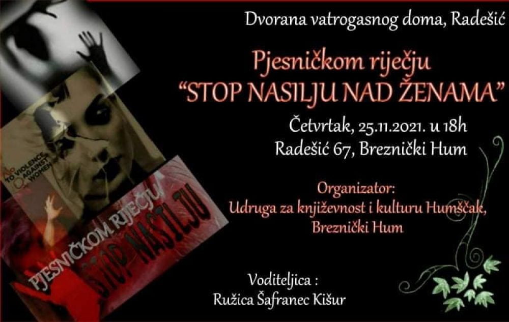 Udruga za književnost i kulturu Humščak iz Brezničkog Huma pridružila se mnogim piscima i pjesnicima u gradovima i mjestima širom Hrvatske i Europe u obilježavanju Međunarodnog dana protiv nasilja nad ženama. Obilježavajući 25. studenoga - Međunarodni dan borbe protiv nasilja nad ženama tribinom u Radešiću javnosti je jasno odaslana poruka o važnosti ukazivanja da nasilje nad ženama zapravo jasno govori o neravnopravnosti u društvu i ustaljenim obrascima rodne neravnoteže, koje je nužno svakodnevno mijenjati.
