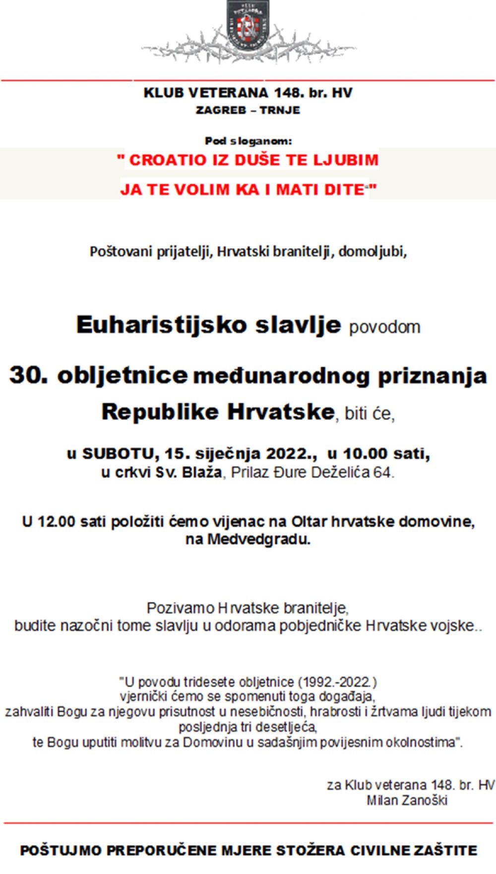 "Današnji dan - 15. siječnja 1992. - bit će zlatnim slovima uklesan u cijelu, četrnaest stoljetnu, povijest hrvatskog naroda na ovome prostoru, za nas svetom tlu između Mure, Drave, Dunava i Jadrana. Nakon što je proglasila svoju samostalnost i suverenost, i raskinula svoje državno-pravne veze s bivšom jugoslavenskom državnom zajednicom, Republika Hrvatska postigla je i međunarodno priznanje svoje neovisnosti"