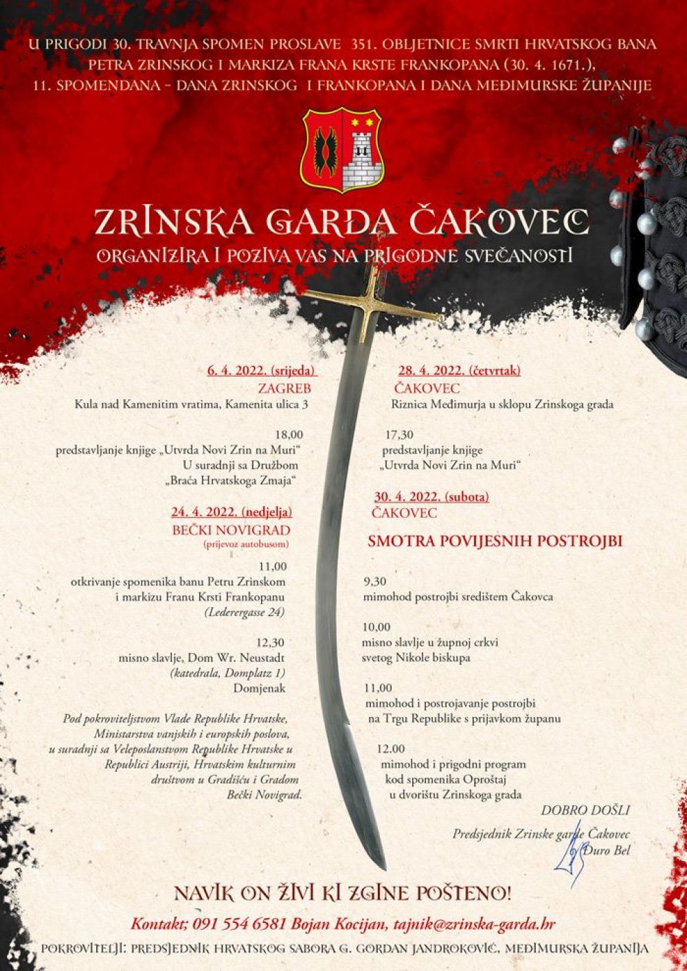 Dane Međimurske županije svojim programom nastavlja Zrinska garda uz postrojavanje povijesnih postrojbi uz spomendan Zrinskih, 30. travnja. U povodu 351. obljetnice pogibije hrvatskih mučenika i velikana kao i 11. obljetnice Spomendana Zrinskih i Frankopana kojeg je proglasio Hrvatski Sabor u listopadu 2011. godine na prijedlog Zrinske garde Čakovec, sutra, 30. travnja Čakovec će biti mjesto postrojavanja povijesnih postrojbi na čelu sa Zrinskom gardom. Garda je 2019. postavila spomenik hrvatskim mučenicima Petru Zrinskom i Franu Krsti Frankopanu u Bečkom Novigradu. Uz nazočnost predstavnika Grada Wiener Neustadta, Županije Međimurske i Grada Čakovca, Gradišćanskih Hrvata u Austriji i hrvatskog veleposlanika u Austriji spomenik je svečano otkriven 24. travnja ove godine.