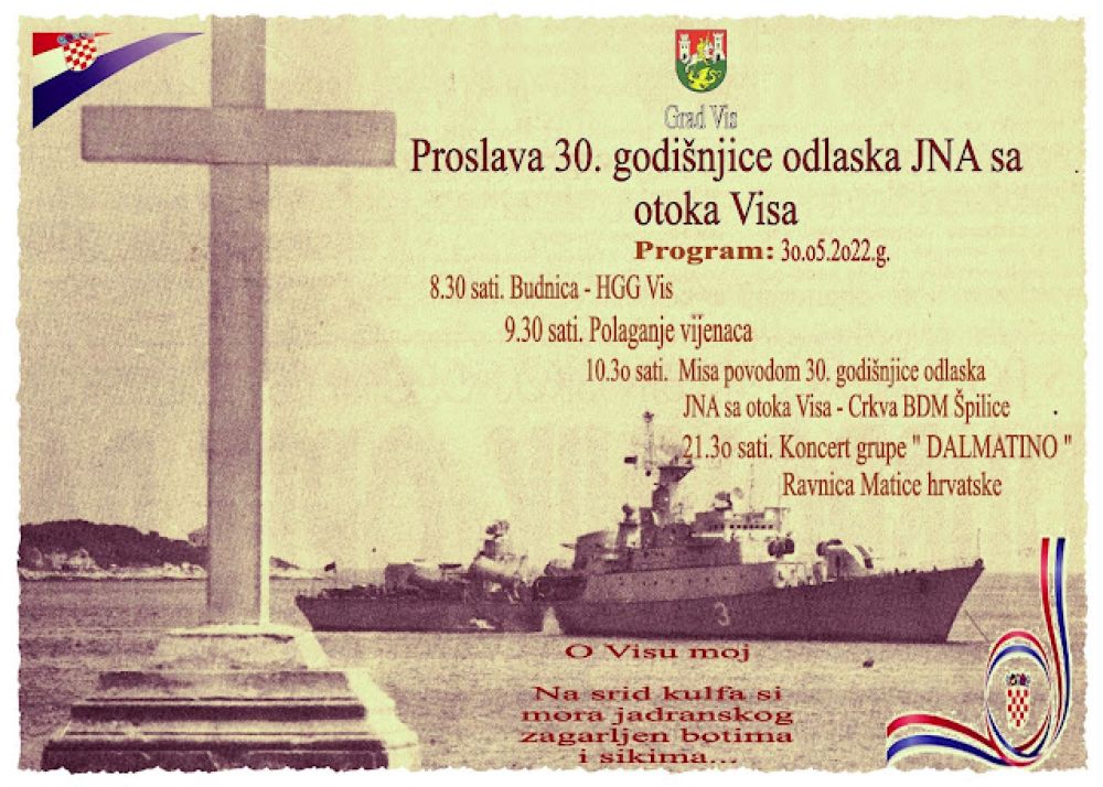 Sudeći prema programu koji se priprema u gradu Visu 30. svibnja u povodu proslave 30. obljetnice odlaska JNA iz toga grada i s otoka(koji je najudaljeniji nastanjeni otok na Jadranu) bit će to opet fešta kakva je bila prije tri ali i dva desetljeća i svake godine: euforija, radost, pjesma, brodice, zastave, Hrvatska gradska glazba (HGG) Vis, misa, polaganje vijenaca, večernji koncert... – fešta na viški način – onako iz i od srca!