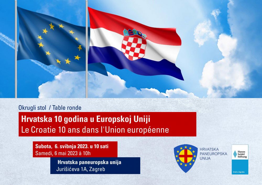 Hrvatska paneuropska unija i Zaklada Hanns Seidel – Ured u Zagrebu organiziraju u subotu, 6. svibnja s početkom u 10 sati okrugli stol „Hrvatska 10 godina u Europskoj uniji“ u Hrvatskoj paneuropskoj uniji (Jurišićeva 1A, Zagreb).