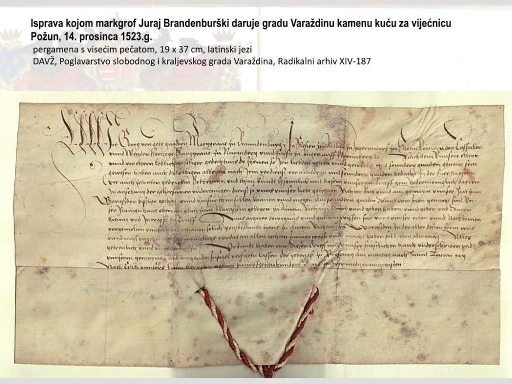 U četvrtak 14. prosinca obilježava se 500 godina kako je markgrof Juraj Brandenburški poklonio Varaždincima svoju kamenu kuću za vijećnicu. U povodu toga velikog jubileja Državni arhiv u Varaždinu izložit će izvornu ispravu koja se čuva u arhivu. Uz nju, izloženi su dokumenti koji govore o odnosu Jurja Brandenburškog i Varaždinaca o borbi Varaždinaca da ponovno dođu u posjed vijećnice nakon što su je izgubili u najtežem razdoblju gradske povijesti. Na izložbi se također nalazi grbovnica grada Varaždina iz 1464., pa je to jedinstvena prilika da se vidi ova predivna isprava iz fundusa Državnog arhiva u Varaždinu.
