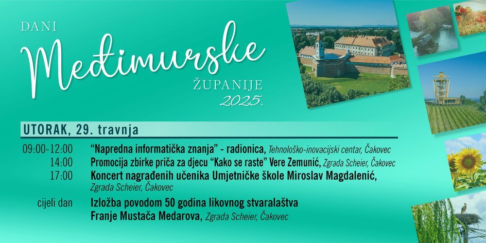 U sklopu programa Dana Međimurske županije 2025., koji se održava od 21. travnja do 11. svibnja, podsjećamo na događanja koja nas očekuju sutra, u utorak 29. travnja: