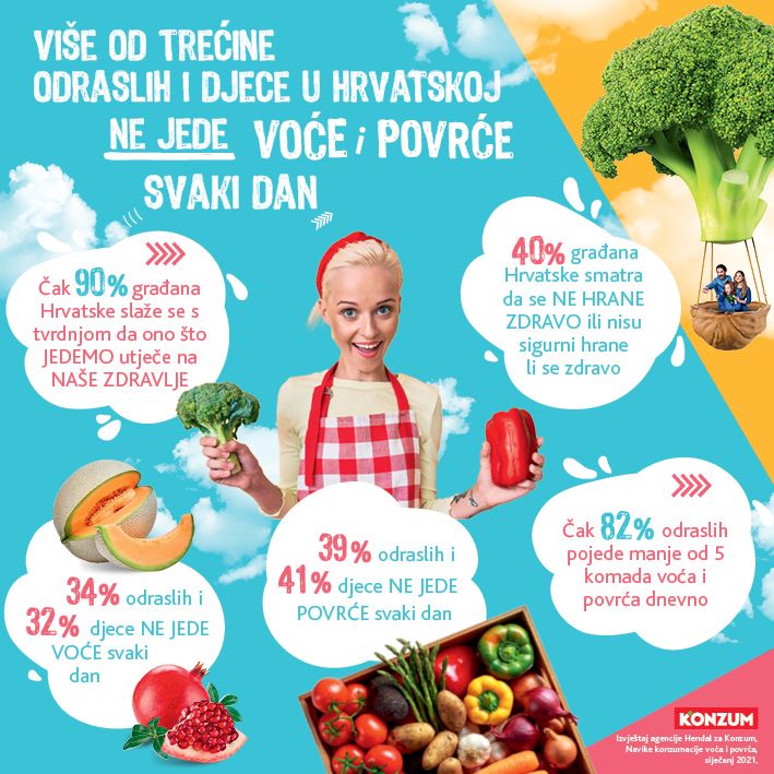 Iako se čak 90 posto građana Hrvatske slaže s tvrdnjom da ono što jedemo utječe na naše zdravlje, ipak 40 posto smatra da se ne hrane zdravo ili nisu sigurni hrane li se zdravo. Pokazuje to istraživanje o navikama konzumacije voća i povrća među građanima Hrvatske koje je u siječnju 2021. za Konzum provela agencija Hendal. Među odraslim ispitanicima 30 posto smatra da ne jede dovoljno povrća ili nisu sigurni jedu li dovoljno povrća, a 38 posto isto tvrdi za voće. Istraživanje pokazuje i da 34 posto odraslih i 32 posto djece ne jede voće svaki dan, a 39 posto odraslih i 41 posto djece ne jede povrće svaki dan. Iako uravnotežena prehrana podrazumijeva konzumaciju 5 komada voća i povrća dnevno, čak 82 posto odraslih dnevno pojede manje od toga.