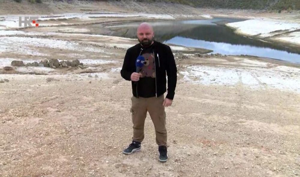 Suša u Dalmaciji izazvala je drastičan pad razine Peručkog jezera, pa se naša ekipa sa svojim sugovornicima naša na mjestu koje je inače na dubini od 20 metara ispod površine.