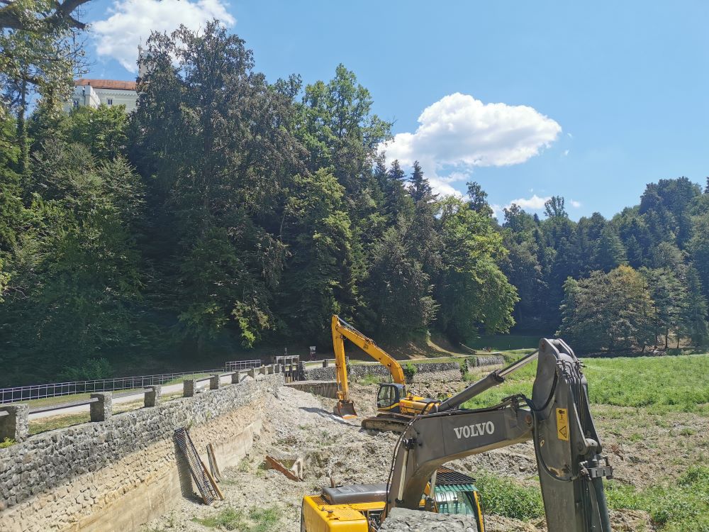 Za današnjeg posjeta Trakošćanu ostali smo nemalo iznenađeni izgledom Trakošćanskog jezera, ili bolje rečeno nekadašnjeg jezera, jer na mjestu gdje je nekad bila voda, danas je zelena livada. Nakon što je proljetos ispuštena voda iz jezera kako bi se ono očistilo od nagomilanog mulja i povećala protočnost vode, radovi nisu odmaknuli kako bi se očekivalo. Naprotiv, na dnu jezera ostalo je nekoliko strojeva na čije se gusjenice već dobrano nahvatala rđa, a jezero je zaraslo u travu i nisko raslinje. Pogledajte fotografije: Iako je isušeno, jezero je i takvo, zeleno, atraktivno za šetače, jer neki i ne znaju da bi trebalo biti drugačije.
