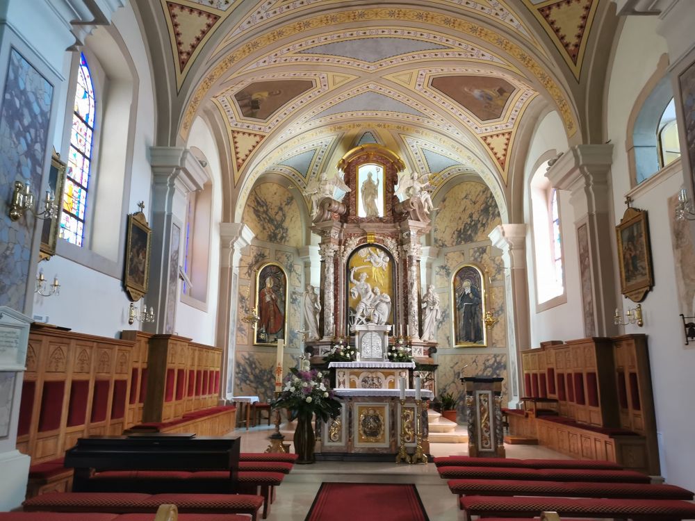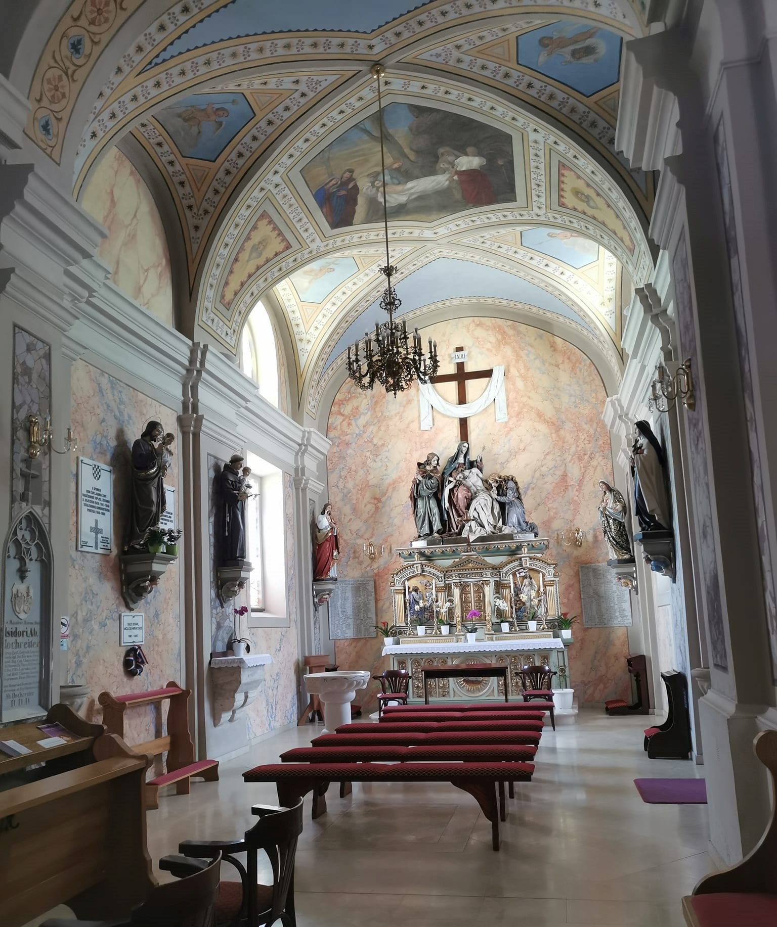 Slikar M. Antonini oslikao je 1885. g. čitavu crkvu a posebno su dojmljive stropne freske koje prikazuju prizore iz Isusova života dok u svetištu na stropu nalazimo evanđeliste a pored oltara svete slavenske apostole Ćirila i Metoda.