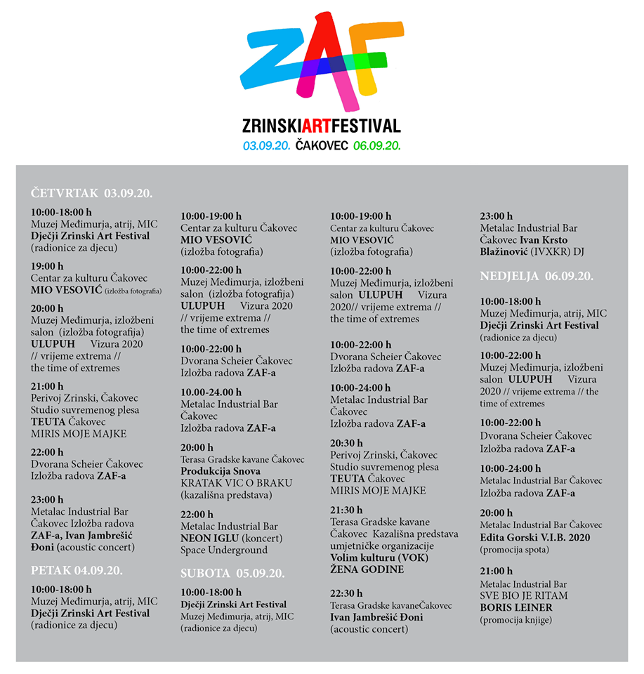 u 18.00 sati – otvorenje Dječjeg ZAF-a u atriju Starog gradam u 19.00 satih – otvorenje izložbe fotografija Mije Vesovića u Centru za kulturu Čakovec, u 20.00 sati – glavno otvorenje festivala i otvorenje izložbe Vizura 2020 u atriju Starog grada, u 21 sat – plesna predstava skupine Teuta u perivoju Starog grada, u 22.00 sata – otvorenje izložbe radova ZAF-a u galeriji Scheier i u 23.00 sata otvorenje izložbe radova ZAF-a i akustični koncert u Metalac Industrial Baru. Za detaljni raspored događanja po danima vidite letak te pratite facebook stranice Zrinski Art Festivala.