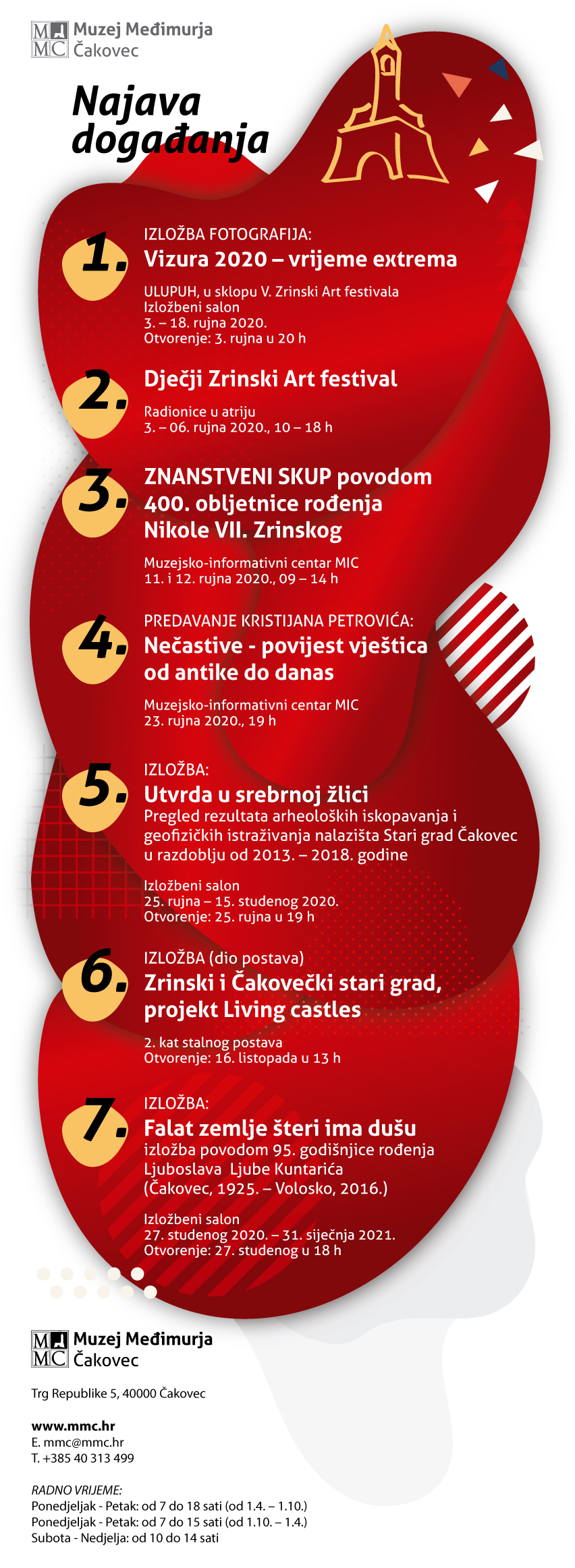 Muzej Međimurja Čakovec – Stari grad Čakovec, Dvorana Scheier, Centar za kulturu Čakovec,Terasa Gradske kavane,Metalac Industrial Bar Čakovec, ugostit će od 3. do 6. rujna ovogodišnji Zrinski Art Festival. Kraj ljeta 2020. godine u gradu Čakovcu već peti puta za redom obilježit će konceptualna manifestacija umjetničkog predznaka – Zrinski Art Festival. Riječ je o međunarodnom festivalu inovativnih umjetničkih praksi – našem čakovečkom autohtonom i urbanom konceptu galerijsko-gerilske umjetnosti koji će višestrukim programima, umjetničkim instalacijama, izložbama i koncertima zaposjesti više lokacija u samom gradu. Izložbe će biti postavljene u Muzeju Međimurja, Centru za kulturu Čakovec i galeriji Scheier, plesna točka prigodom otvaranje festivala odvijat će se u jezeru Starog grada, dok će kazališni programi biti izvođeni na terasi Gradske kavane Čakovec, a glazbeni program u Metalac Industrial Baru. Ovim festivalom u nekoliko dana intenzivnih događanja upregnut će se gotovo svi izložbeno-izvođački kapaciteti našeg malog grada. Zrinski Art festival jednom godišnje Čakovec pretvara u iskonski urbani centar i glavni punkt obrazovanja publike suvremenim umjetničkim tokovima. Ovaj događaj čak možemo nazvati i godišnjom retrospektivom suvremenih umjetnika koji trenutno aktivno djeluju na hrvatskoj i međunarodnoj likovnoj sceni, ali i spoju velikih i priznatih umjetničkih imena s onim mlađim i tek stasalim umjetnicima od kojih se neki tek trebaju afirmirani na domaćoj likovnoj sceni