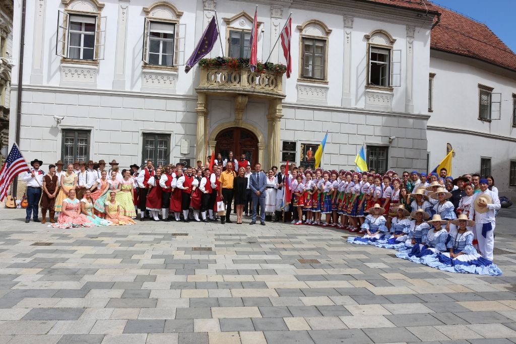 Folklorne grupe iz Švicarske, Slovenije, Kolumbije, SAD-a i Ukrajine ukratko su se predstavile te zahvalile na gostoprimstvu u Varaždinu. Gosti su se upisali u varaždinsku knjigu instalacija, a potom i zajednički fotografirali ispred znamenite Gradske vijećnice Grada Varaždina. Prijem je bio prigoda da se zahvali idejnoj začetnici i organizatorici festivala Petri Golubar, a riječi pohvale uputio je i Enrih Merdić, predsjednik CIOF-a za Hrvatsku.