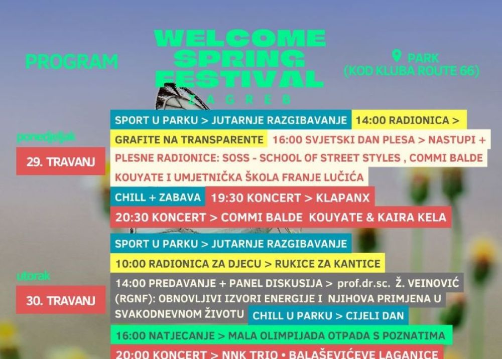 Umjetnost, ples i održivost samo su dio 6. izdanja Welcome Spring Festivala koji otvara sezonu festivala u Zagrebu u ponedjeljak, 29. travnja. Ovogodišnji festival donosi obilje interaktivnih radionica, zanimljivih predavanja, olimpijada i glazbenih nastupa koji će trajati sedam dana, sve do 5. svibnja, na livadi između ulice Hrvatske bratske zajednice i Vukovarske ulice (kod kluba Route 66).