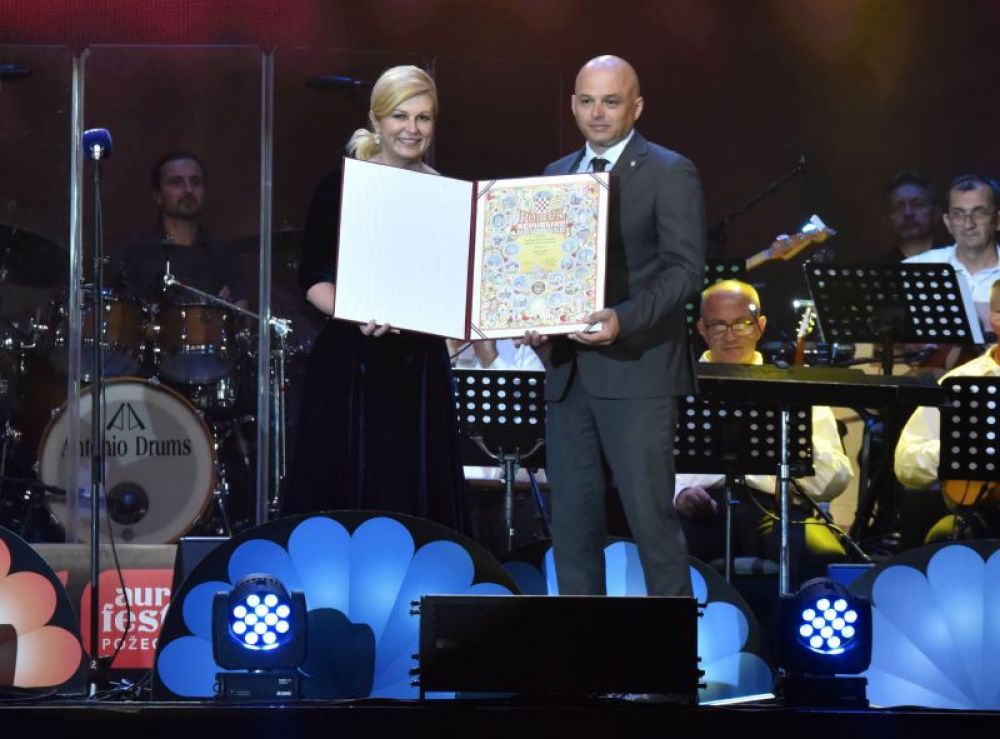 Predsjednica Republike Kolinda Grabar-Kitarović nazočila je Retrospektivi požeškog festivala „Pjevat će Slavonija“. U prigodi pedeset godina postojanja i za neizmjerni doprinos očuvanju slavonskog glazbenog izričaja, kulture, tradicije i baštine, Predsjednica Republike je dodijelila Povelju Republike Hrvatske Festivalu zlatne žice Slavonije.„Zadovoljstvo mi je večeras s vama proslaviti 50. rođendan festivala koji je tijekom pola stoljeća pjesmom najavljivao zlatnu jesen u Zlatnoj dolini“, kazala je predsjednica Grabar-Kitarović istaknuvši kako je glazba Festivala Zlatne žice Slavonije doticala naša srca i donosila nam radost i sjetu.