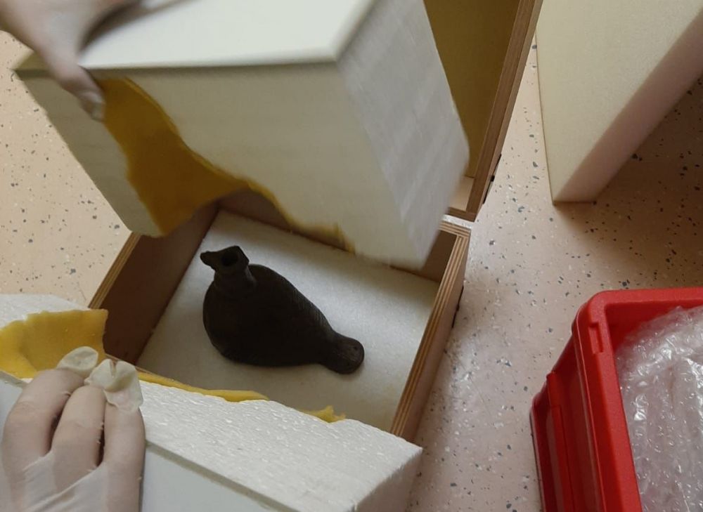 U Arheološkom muzeju u Zagrebu izvršeno je osiguranje posude u obliku ptice tzv. Vučedolske golubice koja je bila izložena u vitrini na trećem katu stalnog postava Pretpovijesnih zbirki. Tijekom potresa razdvojila su se stakla vitrine no Vučedolska golubica nije oštećena. Zbog daljnjih potresa i mogućih naknadnih oštećenja prostora, pohranjena je u svoju već postojeću zaštitnu ambalažu i izmještena s trećeg kata Muzeja. Posuda u obliku ptice iz Vučedola pronađena tijekom istraživanja položaja Gradac na Vučedolu kod Vukovara koja je 1938. godine provodio njemački arheolog R. R. Schmidt pod nadzorom Arheološkog muzeja u Zagrebu najpoznatiji je nalaz tih istraživanja i simbol vučedolske kulture. Rezultati ovih istraživanja objavljeni su 1945. godine u monografiji Die Burg Vučedol, kojom je vučedolska kultura, u znanstvenim krugovima, dobila punu afirmaciju. Oprečna su mišljenja koju vrstu ptice posuda prikazuje; jedni tvrde da se radi o golubici, a drugi o jarebici, a i jedna i druga ptica zastupljene su u simbolici i vjerovanju nositelja vučedolske kulture. Male ptice, pogotovo golubice od davnina su bile pratioci Velike Majke, Velike Božice - ženskoga božanstva s mnogo imena, koja utjelovljuje obožavanje plodnosti i zemlje. Jarebice su povezane s muškim božanstvima i s metalurgijom. One, naime, u opasnosti glume da šepaju, a ta ih hromost najviše povezuje s hromim kovačem Hefestom. Posuda predstavlja stiliziran prikaz ptice s naglašeno voluminoznim tijelom osovljenim na tri ravne, čepaste nožice. Leđa, rep i prsa bogato su ukrašeni rovašenim ornamentom ispunjenim bijelom inkrustacijom, djelomično sačuvanom. To je keramička šuplja posuda, u koju bi stalo oko pola litre tekućine. Radi se o kultnoj posudi za koju se pretpostavlja da se za religijskih svetkovina pri izvođenju nekih rituala u njoj držala tekućina, možda halucinogena. Posuda u obliku ptice, tzv. Vučedolska golubica, nedvojbeno je primjer zanatske vještine keramičara istančanog umjetničkog dara, ali i važan religijski simbol. Rijedak je nalaz životinjske plastike vučedolske kulture, najmlađe i najatraktivnije eneolitičke kulture slavonsko-srijemskog prostora. Posuda u obliku ptice tzv. Vučedolska golubica, Zagrebačka lanena knjiga i Zagrebačku mumija, tzv. Solinjanka, Branimirov natpis i Lumbardska psefizma, najpoznatiji su predmeti koje čuva Arheološki muzej u Zagrebu i po kojima je Muzej poznat kako u Hrvatskoj tako i u svijetu.