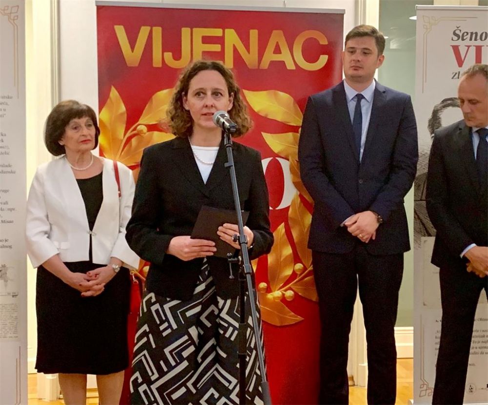„Uvjerena sam kako će urednici i suradnici Vijenca ispuniti ta očekivanja objektivnim i profesionalnim pristupom, primjerenim načinom obrade i prezentacije kulturnih sadržaja kako bi ostali i postali atraktivni i današnjem digitalnom naraštaju“, dodala je ministrica te na koncu izrazila zadovoljstvo što „izložba postavljena u povijesnom zdanju Akademijine knjižnice podsjeća na to koliko je mudra i dalekosežna bila odluka velikoga mecene biskupa Strossmayera da hrvatskome narodu podari njegove najvažnije kulturne, znanstvene i umjetničke institucije“.