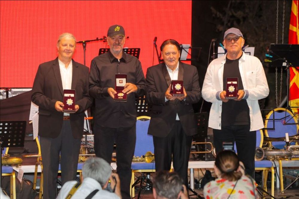 Predsjednik Stevo Pendarovski sinoć je u Skoplju na svečanoj ceremoniji u Kabinetu predsjednika odlikovao Bodana Arsovskog, Kokana Dimuševskog, Vlatka Stefanovskog i Garabeta Tavitjana "Ordenom zasluga za Republiku Sjevernu Makedoniju" za njihovo izuzetno, autohtono i jedinstveno glazbeno stvaralaštvo u okviru jazz-rock grupe Leb i sol.