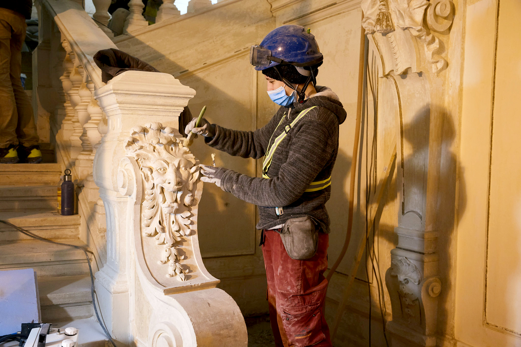 Sada su na svečanom stubištu, kao i u velikoj dvorani, u tijeku restauratorski radovi koje obavlja tvrtka Restaurator d.o.o. Najopsežniji i najdugotrajniji dio posla je uklanjanje naknadnih bojanih slojeva sa zidova i s ograde stubišta. No, ti kompleksni radovi istovremeno donose veliko zadovoljstvo stručnjacima i poklonicima kultnog Glazbenjaka jer otkrivaju prave bisere povijesnog izgleda HGZ-a poput skladnih oslika na zidovima i profinjenih zlatnih obruba na štukaturama i stropnim rozetama.