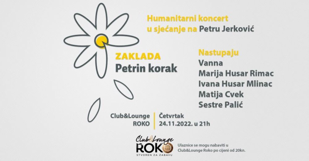 Zaklada za sigurnost u prometu 'Petrin korak', osnovana prije točno godinu dana u spomen na preminulu Petru Jerković, ali i brojne druge koji su stradali zbog nepažnje u prometu, organizira humanitarni koncert koji će se održati na Petrin rođendan 24.11.2022. u klubu Roko s početkom u 21h.