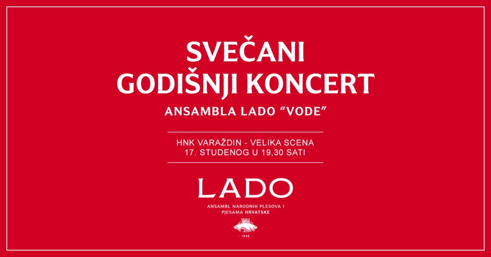 Ovogodišnji svečani koncert Lada, nacionalnog ansambla hrvatskih plesova i pjesama, pod nazivom VODE, posvećen neraskidivoj vezi čovjeka i njegove kulturne baštine s prirodnom baštinom, održat će se 17. studenoga u HNK Varaždin. Pjesmom, plesom i glazbom ovaj tematski koncert prikazuje vode koje su oblikovale život ljudi – utkane kao simboli u običaje ili, pak, snaga koja uvjetuje način života.