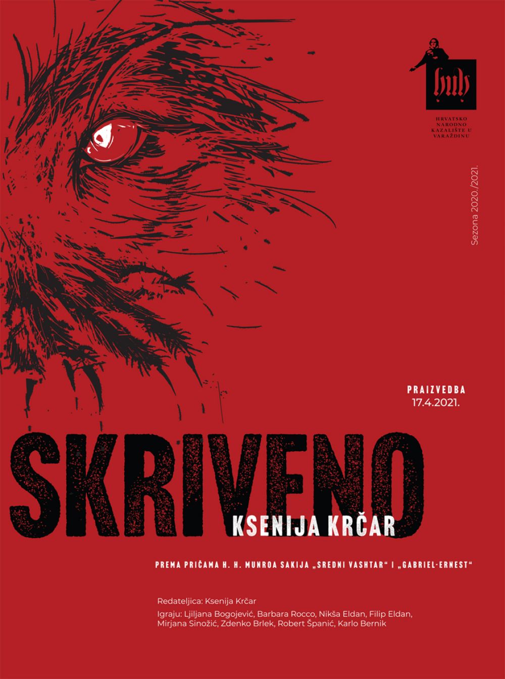 Skriveno, diptih predstava Ksenije Krčar utemeljena na pričama Sredni Vashtar i Gabriel-Ernest znamenitog britanskog majstora kratke priče, H.H. Munroa Sakija, na površinu izvlači mračne tajne dviju naizgled uzornih, građanskih, edvardijanskih obitelji, skrivene duboko ispod debelih slojeva uglađenih manira, dobrog odgoja i krutih društvenih pravila. Skriveno slijedi put otvoren hit-predstavom Horor diptih iz 2019. godine. Dramatizacijom su dva kratka naslova pretvorena u zanimljive kazališne priče koje vrckavo, kroz jezu, humor, dramu i tragediju, dodiruju teme disfunkcionalnih i toksičnih obiteljskih odnosa, jednako aktualnih i danas, kao i u vrijeme kada je o njima, na prijelazu iz 19. u 20. stoljeće, pisao Saki.