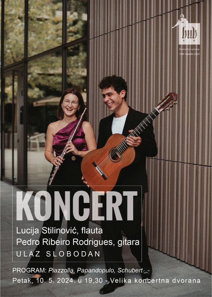 Hrvatsko narodno kazalište u Varaždinu poziva ljubitelje glazbe na koncert dua: Lucija Stilinović na flauti i Pedro Ribeiro Rodrigues na gitari. Koncert će se održati u petak, 10. svibnja s početkom u 19,30 sati u Velikoj koncertnoj dvorani. Na programu su skladbe Astora Piazzolle, Borisa Papandopula i Franza Schuberta.