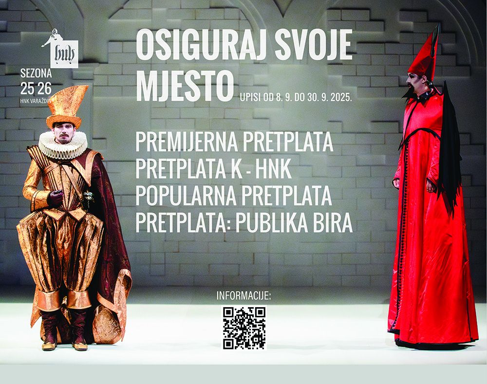 Upis pretplate vrši se na blagajni Kazališta od 8. rujna do 30. rujna 2025. (ponedjeljak do petak od 10-12 i 18 – 19,30, te subotom od 10-12) ili putem online prodaje. Broj pretplata je ograničen