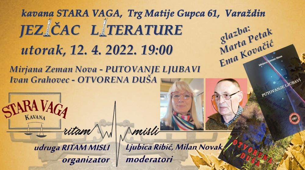 Jezičac literature, program u organizaciji udruge Ritam misli održat će se u utorak, 12. travnja s početkom u 19:00. na već dobro poznatoj lokaciji, kavani Stara vaga na trgu Matije Gupca u Varaždinu.