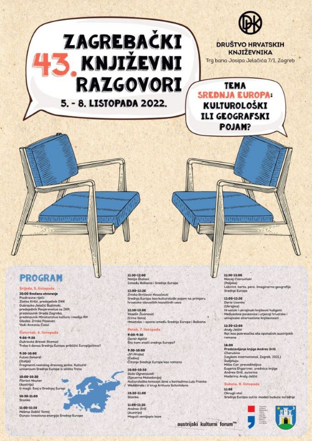 Ove godine se Zagrebački književni razgovori (ZKR) Društva hrvatskih književnika (DHK) održavaju, naravno u njihovim prostorima, od 5. do 8. listopada. Na 43. ZKF-u razgovarat će se o aktualnoj temi 'Srednja Europa: kulturološki ili geografski pojam?', a u DHK-u će govoriti niz uglednih gostiju iz Hrvatske i još mnogih zemalja, a to su Italija, Austrija, Crna Gora, Češka, Sjeverna Makedonija, Poljska i Ukrajina.